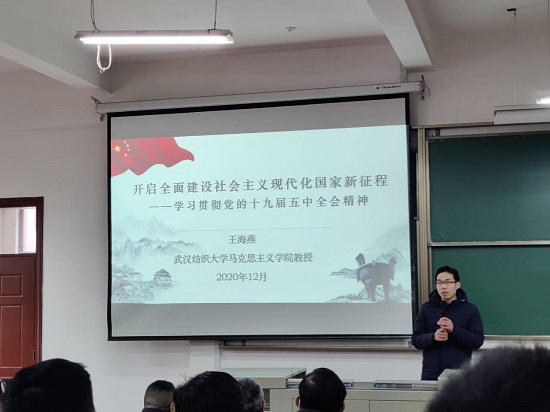 为深入学习领会贯彻党的十九届五中全会精神,12月17日下午,十九届五中全会精神武汉纺织大学宣讲团成员、马克思主义学院教授王海燕赴足球投注平台