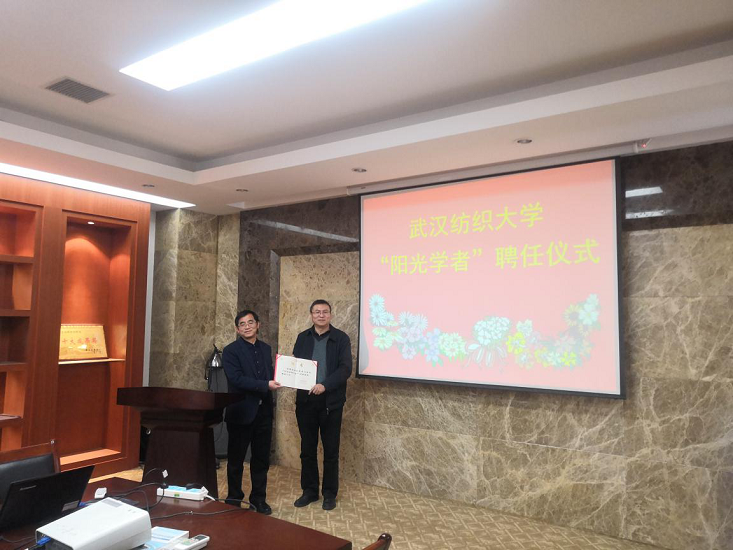 副校长姜明华代表学校对金剑工程师受聘为我校“阳光学者”表示热烈欢迎与诚挚祝贺。他表示武汉纺织大学一直以来都秉持“开放办学、特色发展”的理念,近年来更是围绕“高水平人才引进与培养战略”,为促进一批学科、专业、平台达到国内先进水平,切实提高我校人才队伍的核心竞争力,引进了一大批各学科高层次领军型人才。