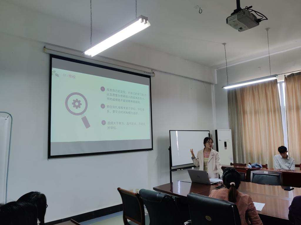 最后,侯畅进行总结发言,并对同学们提出几点期许:一是希望同学们根据自身实际情况选定学校和专业,脚踏实地,认真复习;二是面对困难敢于挑战,勇于攀登,永不放弃;三是积极寻求身边资源,多与专业老师和辅导员沟通,多与学长学姐交流学习;四是合理规划生活,让自己的大学生活不留遗憾。同时,学院也会积极为学生们创造良好的复习环境,提供专业的考研指导,助力学生考研成功。