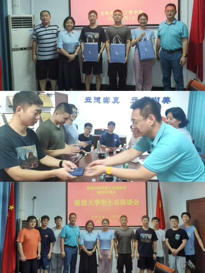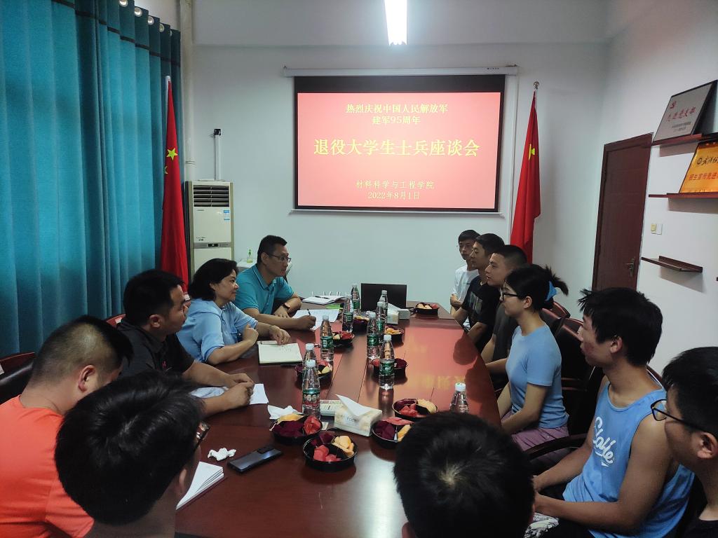 在崇实楼8F-503召开庆祝建军95周年暨退役大学生士兵座谈会。学院党委书记陈桂枝、学工部、武装部副部长朱美龙、保卫处副处长马绪亮出席了本次活动,学院退役大学生士兵代表付印、晏松、孙硕,学院征兵工作分站负责人、毕业班辅导员以及留校本科生研究生学生代表参加了本次会议。