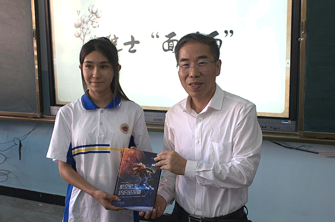 徐卫林院士走进课堂,与精河高中的学生来了一场面对面的“灵魂交流”。“很高兴能够参加本次活动,新疆棉花是个好东西,也有大用处,我们要用先进的技术将新疆棉的价值最大发挥”,徐院士对同学们说到。针对纺织知识,同学们积极提问:“纺织在医用行业还有哪些应用”“汽车也有纺织纤维吗”“纺织纤维如何让建筑更加牢固”。同学们积极提问,徐院士耐心回答,现场气氛异常活跃。随后,徐院士现场向学生代表赠送被评为“2021年武汉市优秀科普作品”的新书《航空航天纺织品探秘》,鼓励同学们好好学习,报效祖国。精河高中学生代表向徐院士赠送了自己用棉花做的工艺品。