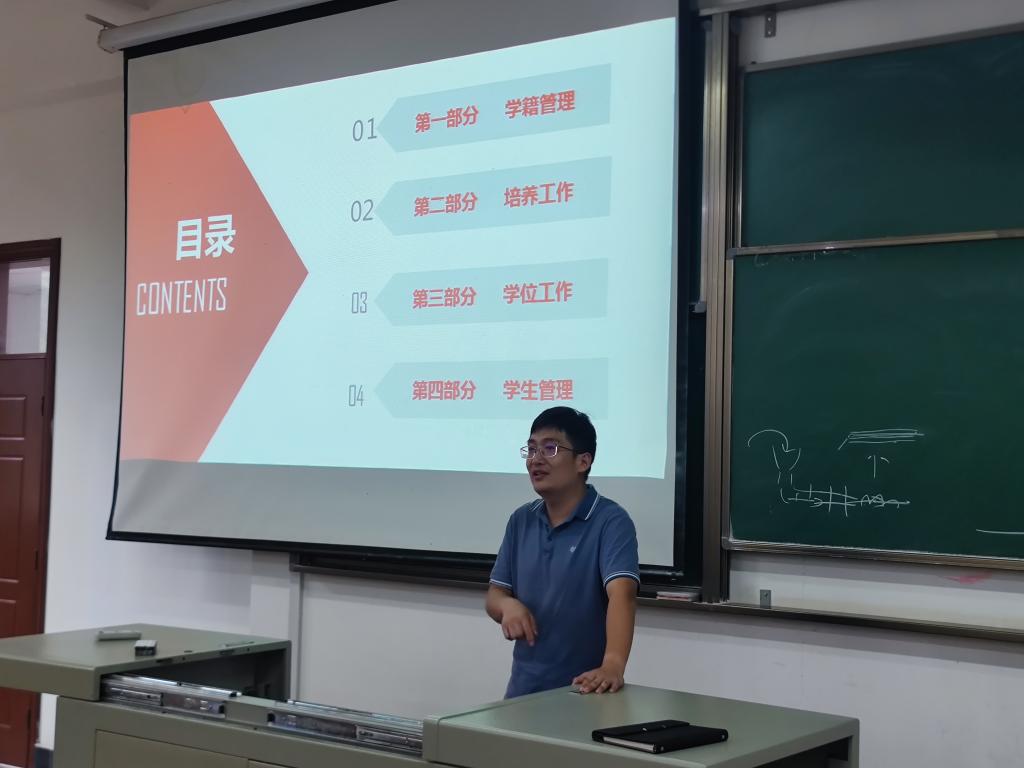 随后,刘欣副院长为新生们讲解研究生培养方案及日常管理制度,并就学籍管理、培养工作、学位工作、学生管理等四个方面进行详细讲解。他表示,研究生三年是人生的关键时期,希望大家珍惜时光、努力学习,学有所成,汇报社会。