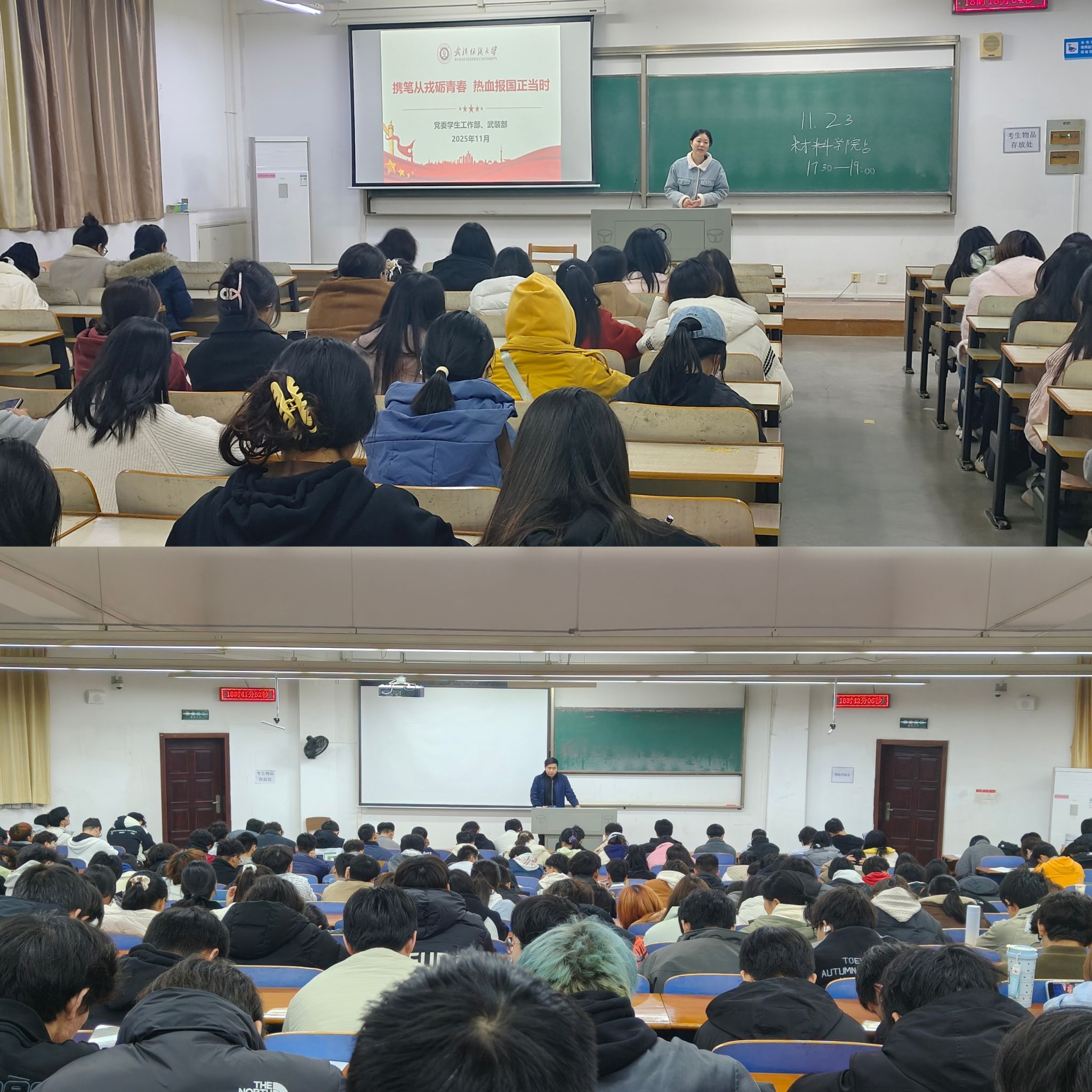 各年级以“携笔从戎砺青春,热血报国正当时”为主题召开了年级大会和班会。会上,各年级班主任、辅导员分别做入伍政策宣讲,详细介绍了2026年征兵报名时间、入伍基本条件等内容,鼓励同学们积极报名,为同学们答疑解惑。同时,对大学生参军的学费补偿、升学优待、就业安置等优待政策进行了重点解读。